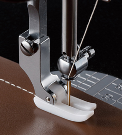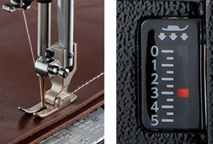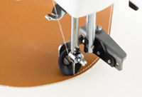 特殊材料で作られた押さえが、皮革やビニール等の滑りが悪く縫いにくい素材の布送りをスムーズにします。